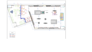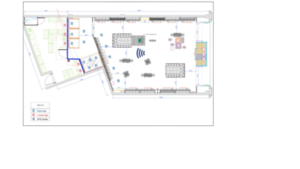 (Example of an architecture plan for RAIN RF confinement using a physical barrier / validated through read testing. Here in blue, the shielding separates the sales floor from the backroom.)